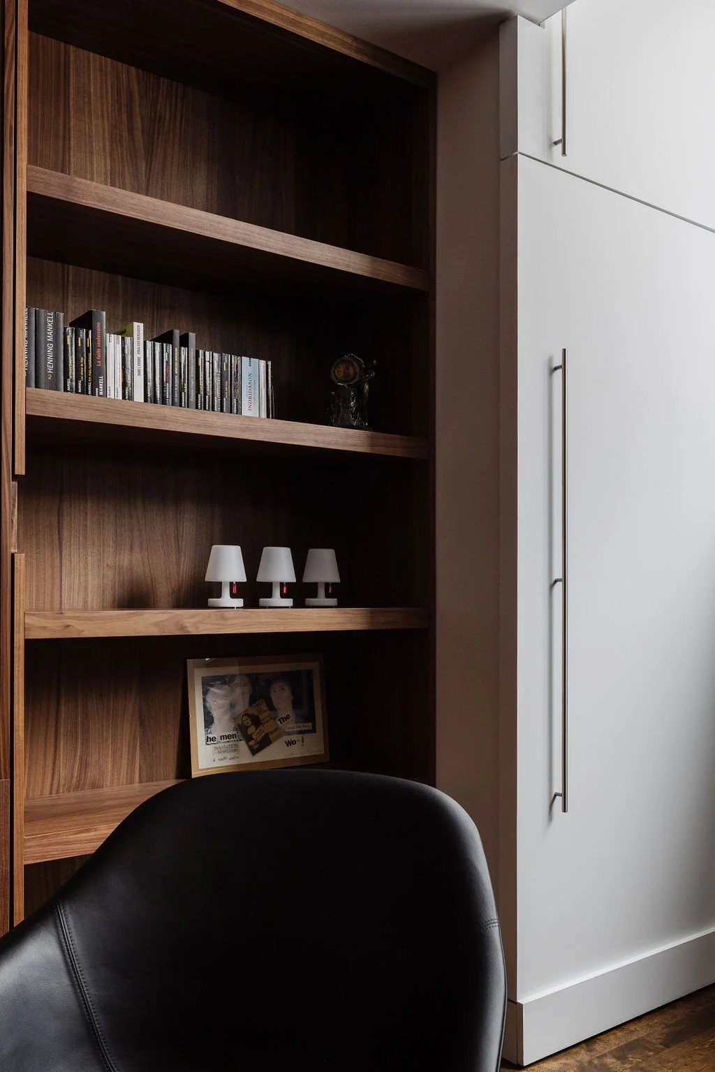 Dans le bureau/chambre d’amis/gym, nous avons créé du mobilier sur mesure afin d’intégrer le murphy bed et créer en même un espace de rangement. Le bureau, quand a lui, a été déplacé vers les fenêtres afin d’avoir de la lumière naturelle pour travailler. On y a également ajouté des panneaux en feutre sur mesure afin d’insonoriser un peu mieux l’espace et d’amener de la texture.