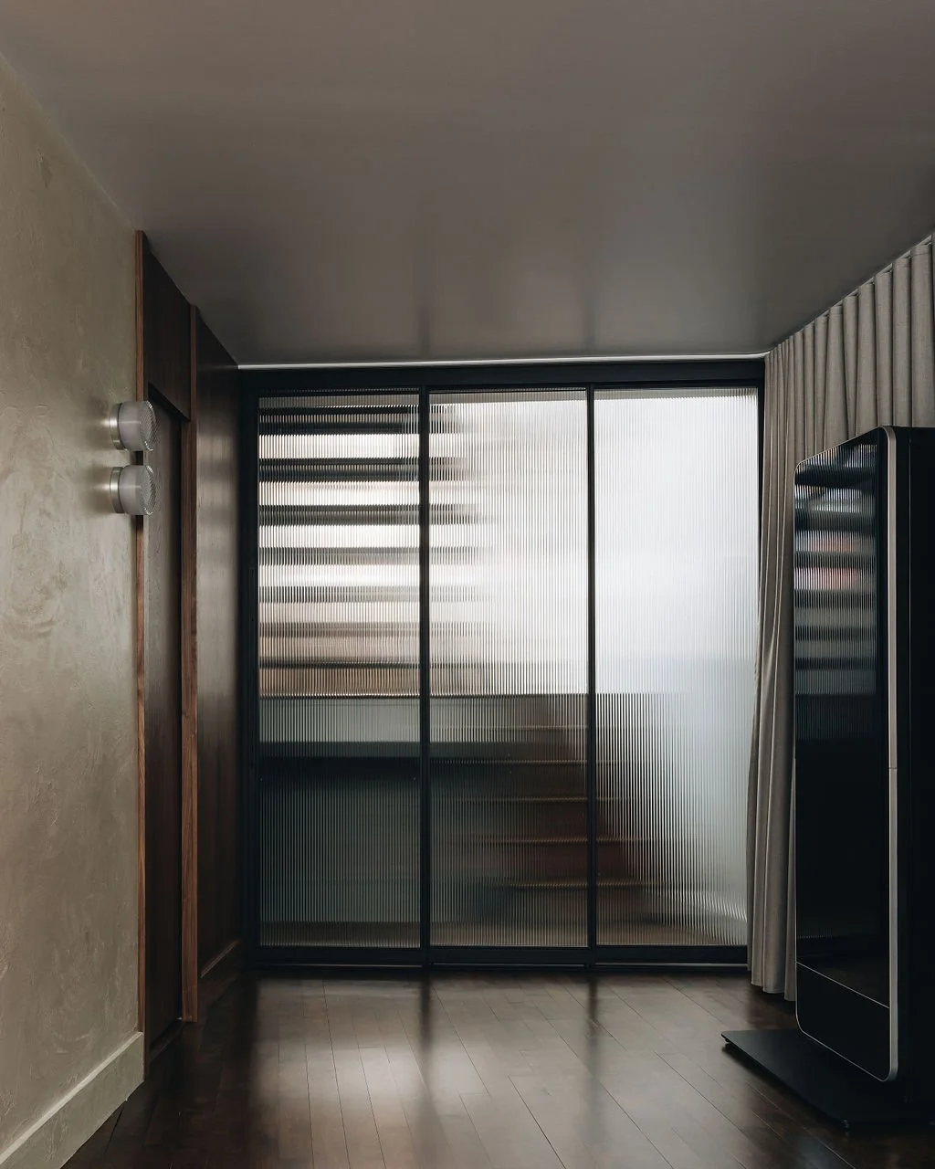 Nous avons également créé une divison en acier et verre flutex afin de cloisonner l’espace quand nécessaire tout en la lumière circuler.